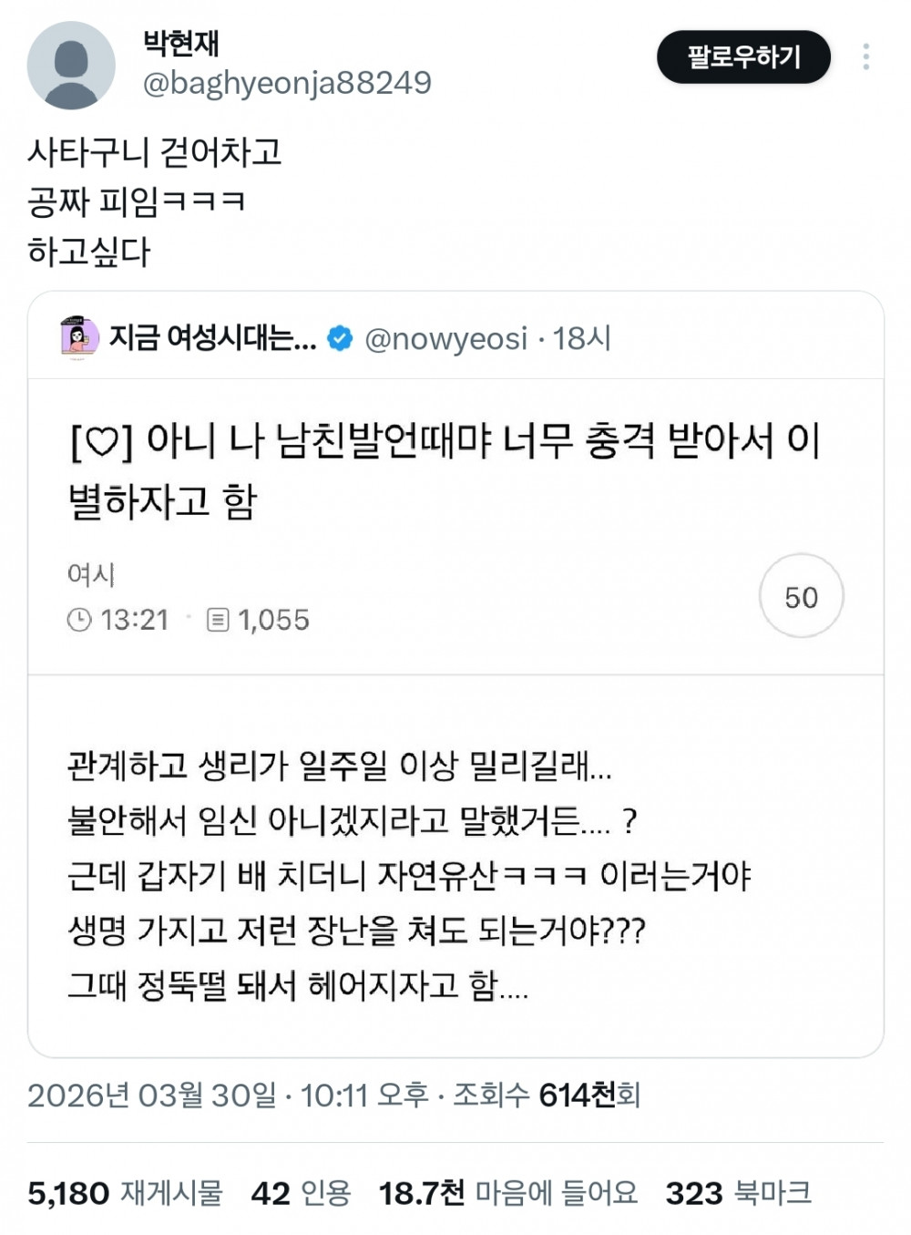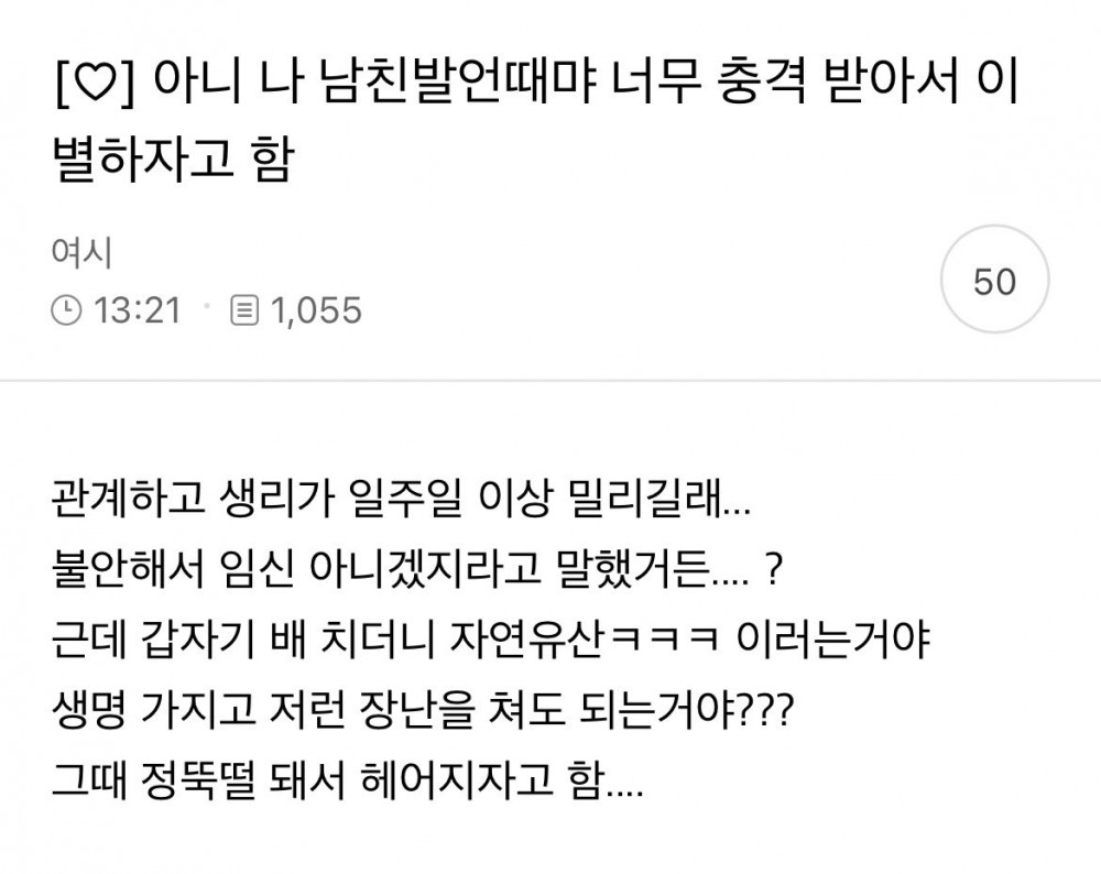 남친 발언 때문에 충격 받아서 이별하자고 함